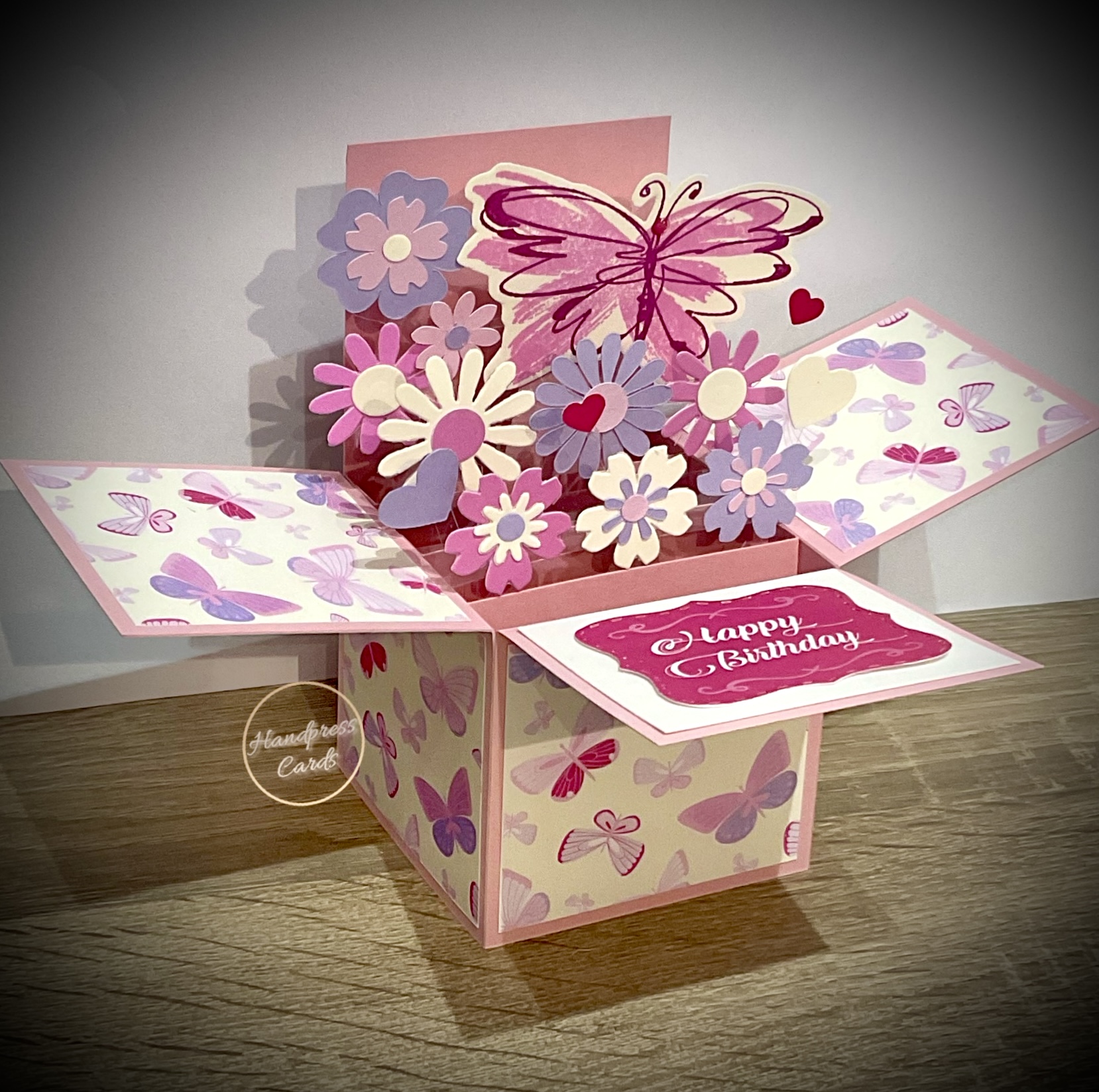 These cards are unique and individual and each one will be slightly different. You can pick the message for this card. This pop up Card folds flat and pops open to a freestanding box with pastel flowers and large butterfly.