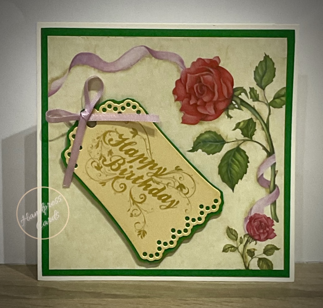 Red Rose Birthday card featuring raised tag with mauve ribbon.