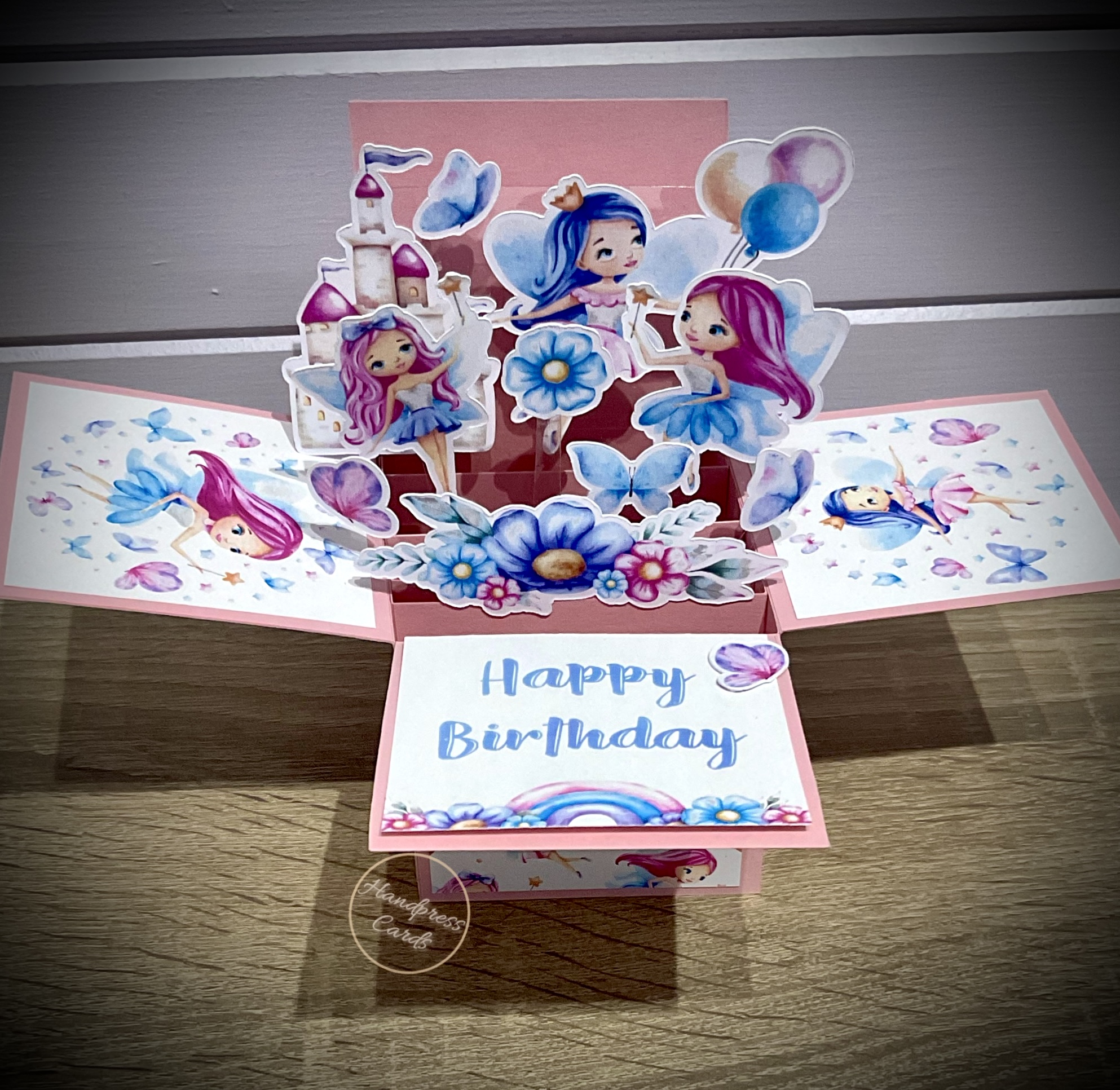 This Birthday card folds flat and pops open to a free standing box in a fairy theme. It can include name and age on the front.