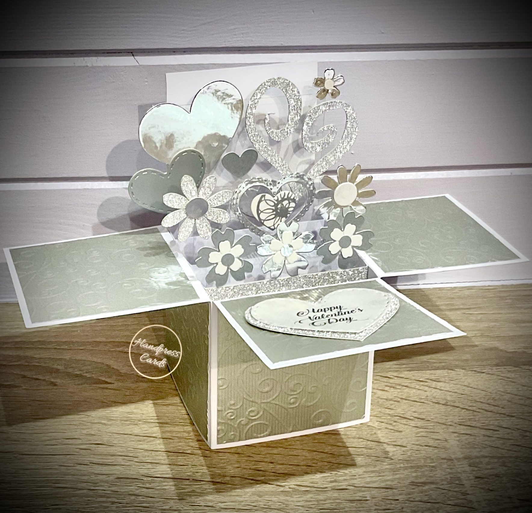 This pop up Card folds flat and pops open to a freestanding box filled wth heart and flowers in silver and Glitter. Box panels are embossed.