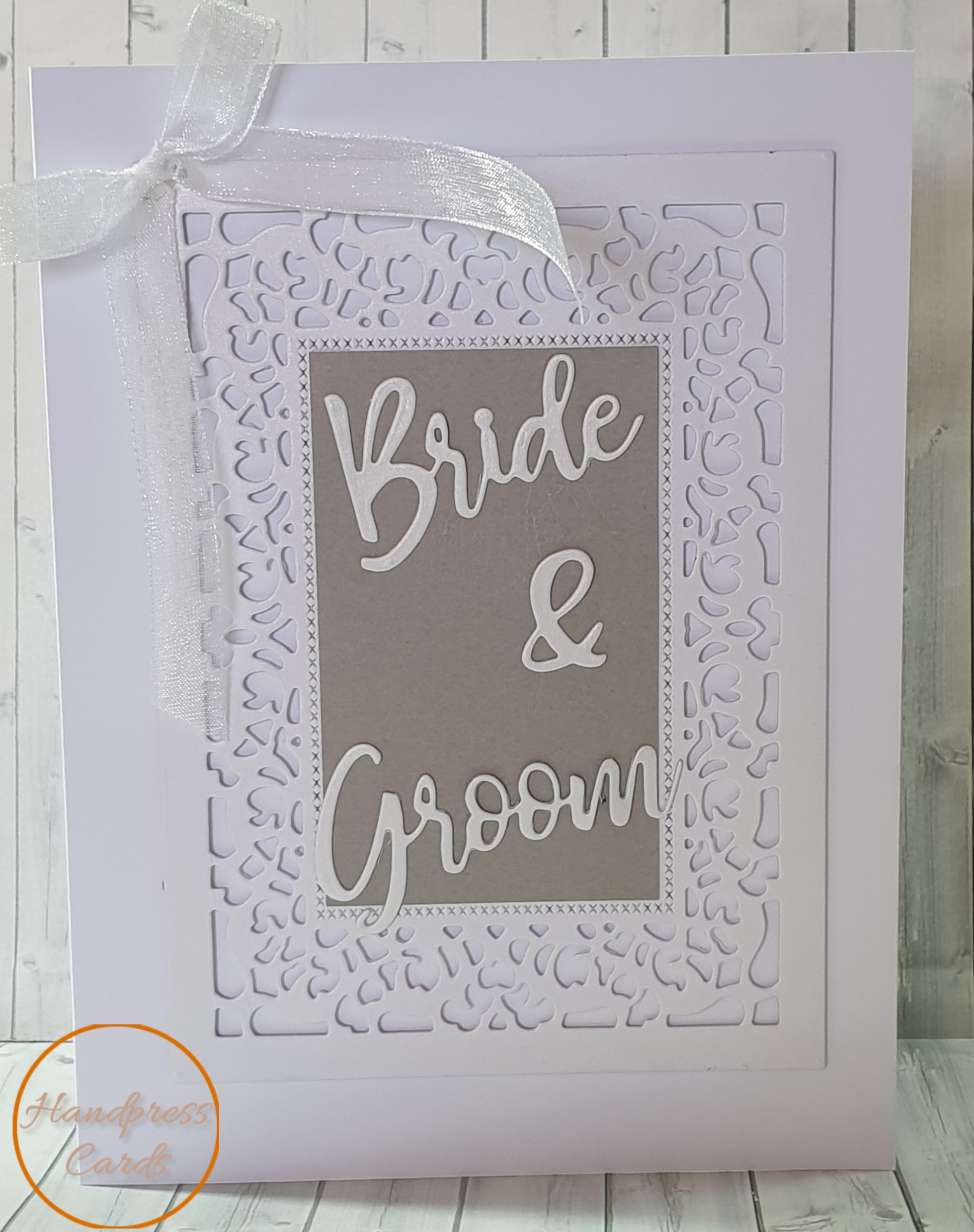 The front of the card features a filagree frame in a slightly off white colour and a light grey insert, this handmade wedding card will intricately detailed to capture the essence of their love and commitment. To complete the card there is a crystaline bow.